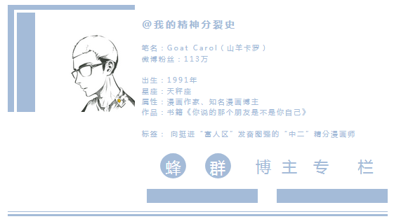 2015年夏天,卡罗注册了 @我的精神分裂史 着手运营,至今已是坐拥百万粉丝的大V博主。