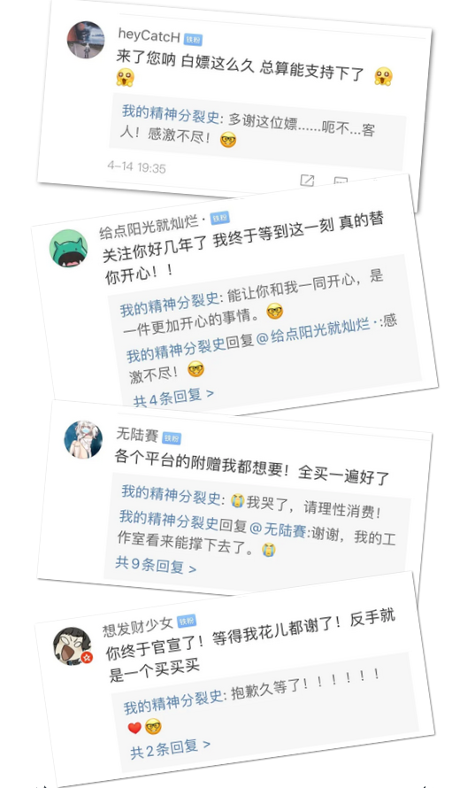 至今,@我的精神分裂史 已有113万+粉丝量,除了出书没有固定的商业变现模式,每个月入不敷出,仍甘之如饴。他表示“没有多少人能够做着自己喜欢的事情,想着实现自己的梦想,刚好我和我的工作室,能有这样的机会,以这样的方式在深圳生活,很幸运;并不是每个人都把盈利看得很重要。”