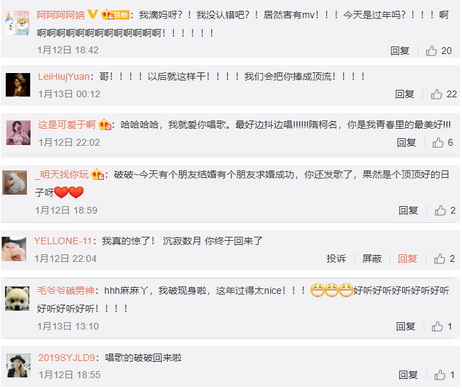 Q:你重新回到微博,你的粉丝都过年了,而且都在夸你唱功有长进。