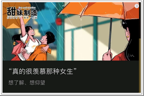 从「甜妹制造」运营负责人-马儿那得知, 他们每周一都会做选题讨论会,根据成员的一些见解、故事以及一些社会现象观察,找到适合产生共情的主题进行创作。编辑提出的选题,会跟团队讨论是否能产生共鸣,如果大家都觉得有兴趣就开始刨根问底,狠的编辑还会把自己的前任拿出来讨论开刀。