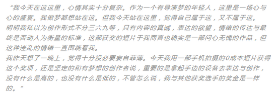 -蜂群一直在挖掘培养影视方向的人才,你这次获奖对蜂群来说是依然一个很大的惊喜,你怎么看待这次经历?