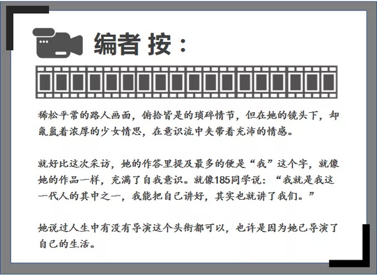 她年轻的人生似乎也像电影一样,充满着戏剧冲突的戏谑与剧情张力的美感——比如,她一而再三而竭的艺考落榜和中国第四代导演谢飞的“钦点”;她的爱而不得和无心插柳;她158cm的真实身高和号称“185同学”的B站ID。