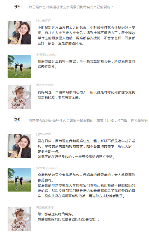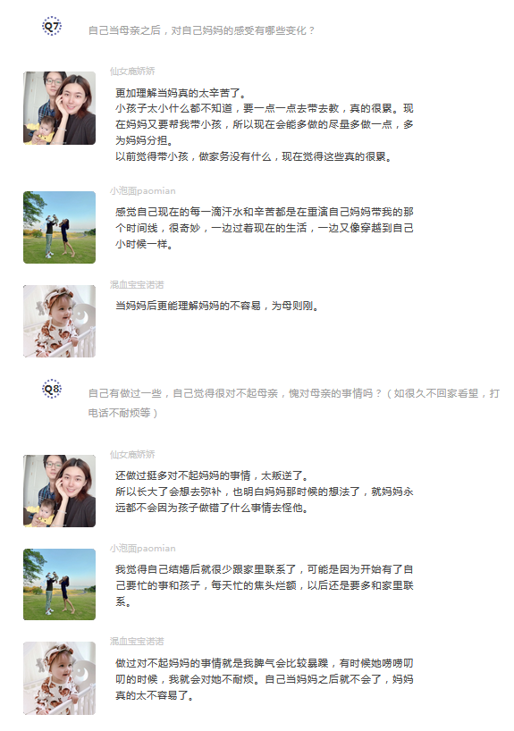 妈妈是很让人动容的两个字,此次母亲节,特地采访了公司已经当妈妈或是准妈妈的博主,即将进入婚姻情侣博主以及当妈妈的员工们,希望大家能从不同群体感受不同类型“妈妈”这个伟大的群体,去包容她们,像她们爱你一样去爱她们。