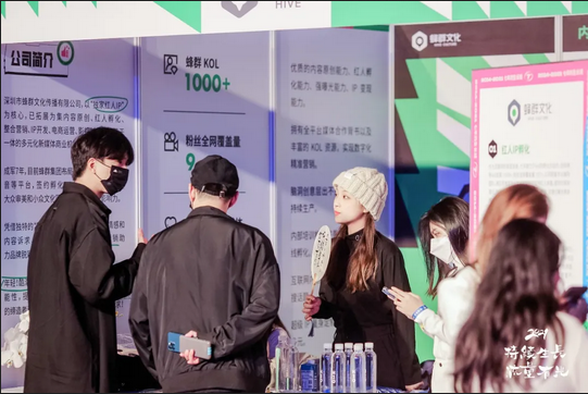 为了使各位嘉宾能进行更直接和深入的探讨,悦普峰会现场还设置了展位区域。作为业内闻名的老牌MCN机构,蜂群文化的专属展位区不仅迎来了老朋友的拜访,也吸引了不少新的朋友。